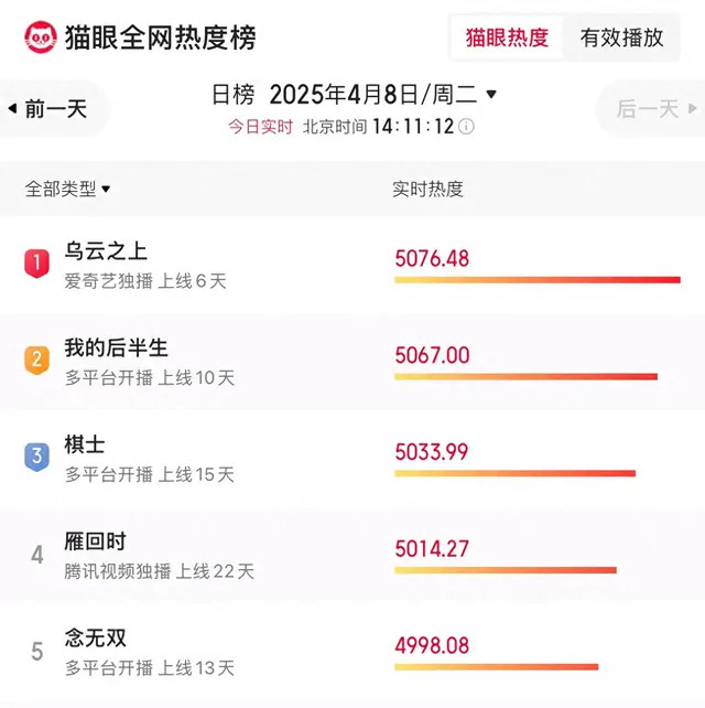 《乌云之上》空降开播已经6天了,热度持续飙升,截止到昨天,已经连续三天稳坐猫眼热度榜第一,播放量也已经超越了同期同类型的《棋士》、《沙尘暴》。